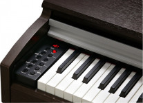 M210 cabinet Spinet-stye cabinet available in simulated rosewood or white finishes, featuring a 30-watt, 2-speaker stereo sound system, built-in music stand and slide-out fallboard.